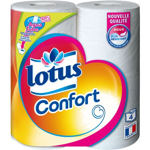Papier toilette LOTUS® Confort blanc AQUA TUBE®, 2 épaisseurs x4 rouleaux. Grâce à l'expertise Lotus dans la sélection des fibres vierges de grande qualité, LOTUS® Confort vous offre toujours l’association parfaite d’une douceur extrême et d’une très grande résistance. Aux extraits de Lotus, symbole de bien-être et de douceur.