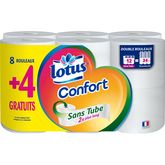 Pour ne plus jamais être ennuyé par des tubes vides dans vos toilettes, essayez le premier papier toilette Lotus Confort SANS TUBE. C'est simple, vous n'avez qu'à le placer sur votre dévidoir et à la fin… il ne reste rien. En plus, comme il est deux fois plus long que votre papier toilette Lotus Confort habituel, vous le changerez moins souvent ! Lotus Confort Papier toilette SANS TUBE x8+4 rouleaux Blanc (12=24)