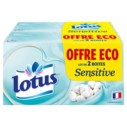 Boîte de mouchoirs LOTUS® Sensitive, 80 mouchoirs. Si vous êtes amenés à vous moucher régulièrement au cours de la journée, les mouchoirs LOTUS® Sensitive prennent soin de vous. Ultra-doux et enrichis en fibres de coton, ils respectent parfaitement votre peau sensible, mouchoir après mouchoir. Idéals pour les peaux sensibles et celles des enfants. Boîte Mouchoirs Lotus Sensitive Offre Eco 2x80