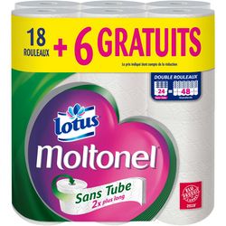Papier toilette Lotus Moltonel Sans Tube x18+6 rouleaux (24=48) Pour ne plus jamais être ennuyé par les tubes vides dans vos toilettes, essayez le premier papier toilette Lotus Moltonel Sans Tube. C'est simple, vous n'avez qu'à le placer sur votre devidoir et à la fin… il ne reste rien. En plus, comme il est 2 fois plus long que votre papier toilette Lotus Moltonel habituel, vous le changerez moins souvent! Le complément idéal au papier toilette humide!
