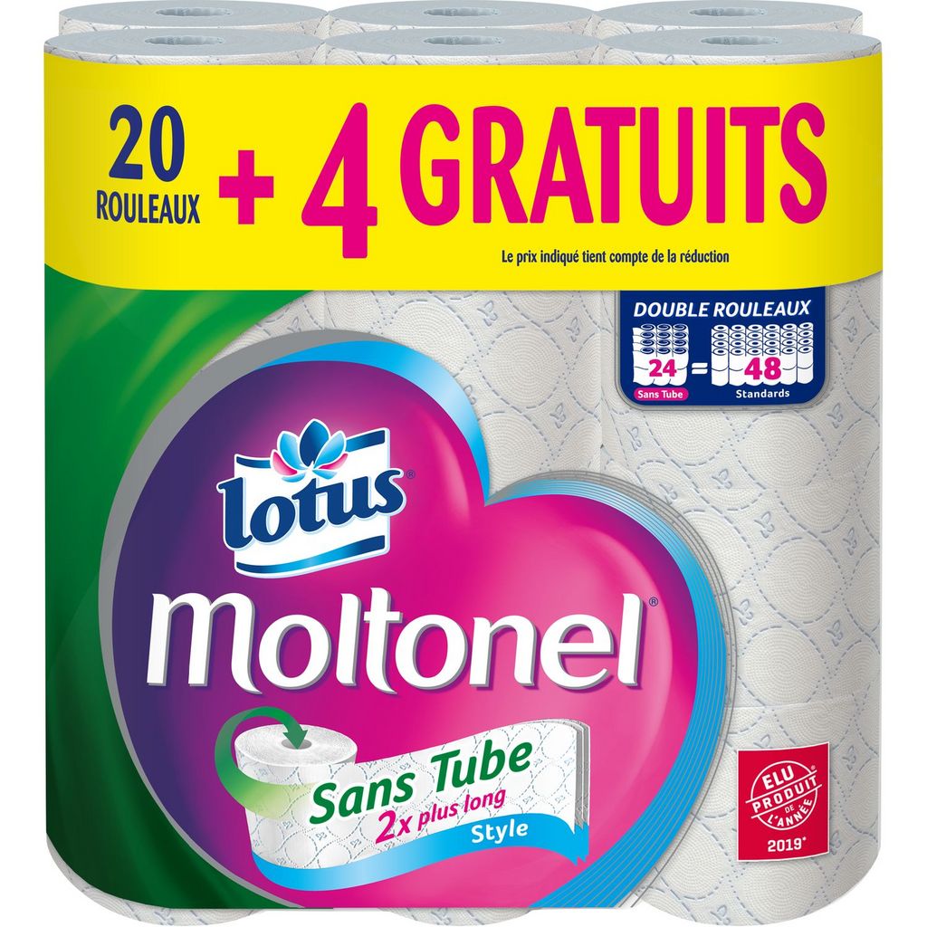 Pour ne plus jamais être ennuyé par les tubes vides dans vos toilettes, essayez le premier papier toilette Lotus Moltonel Sans Tube. C'est simple, vous n'avez qu'à le placer sur votre devidoir et à la fin… il ne reste rien. En plus, comme il est 2 fois plus long que votre papier toilette Lotus Moltonel habituel, vous le changerez moins souvent! Papier toilette Lotus Moltonel Sans Tube Style x20+4 rouleaux (24=48)