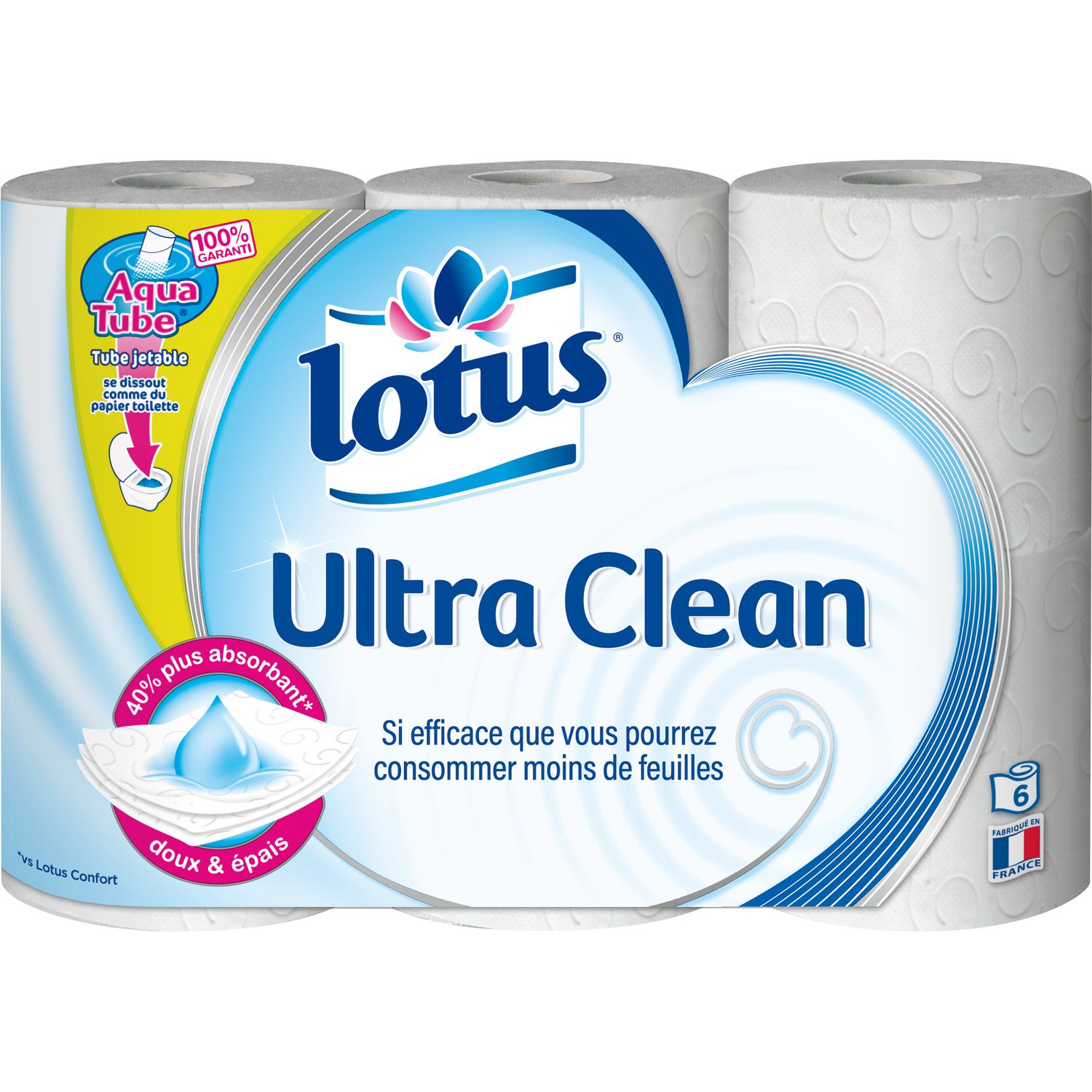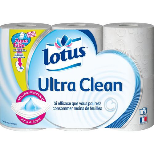 Le papier toilette Lotus Ultra Clean retient mieux les liquides et les saletés. Ces 3 épaisseurs augmentent l’absorption jusqu’à 40% par rapport à notre papier toilette classique* pour vous permettre d’utiliser moins de feuilles tout en conservant la douceur que vous attendez de Lotus. *Vs Lotus Confort) Et en plus, son tube Aqua Tube est jetable dans les toilettes, biodégradable et recyclable. Lotus Ultra Clean est fabriqué en France. Papier toilette Lotus Ultra Clean x6 rouleaux