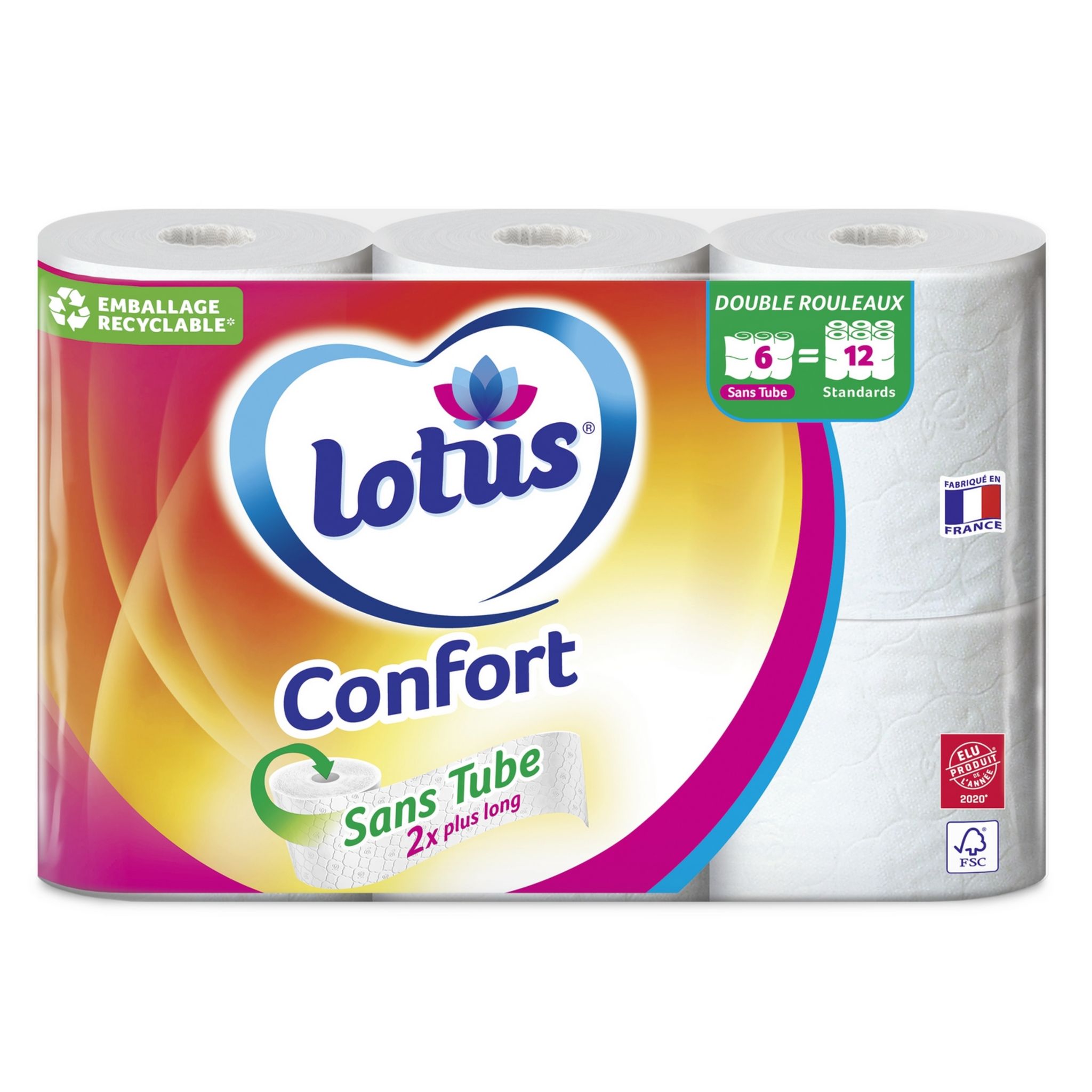 Papier toilette Lotus Confort Sans Tube Blanc x6 rouleaux (6=12) Double épaisseur Equilibre parfait entre douceur et résistance Sans Tube pour ne jamais être ennuyé par des tubes vides 2x plus long que votre Lotus Confort habituel Fabriqué en France Le complément idéal au papier toilette humide !