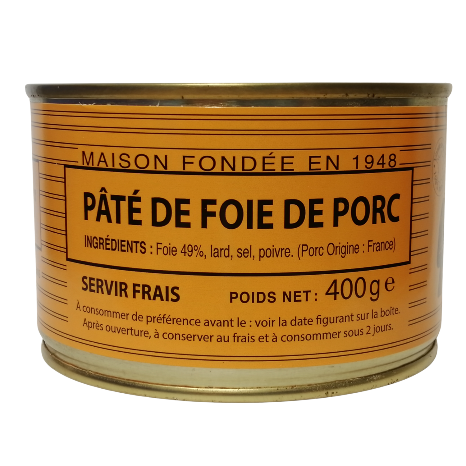 Ingrédients : FOIE DE PORC 49%, LARD DE PORC (ORIGINE FRANCE), SEL, POIVRE.
