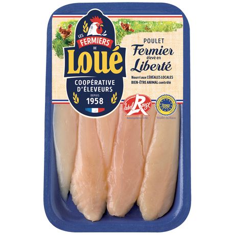 De généreuses aiguillettes de poulet fermier de Loué Label Rouge. Des aiguillettes savoureuses qui reflètent le mode d'élevage unique du poulet de Loué : élevé en liberté, nourri aux céréales locales sans ogm (<0,9%). Elles se prêteront à de multiples recettes : juste cuites à la poêle ou en sauce.