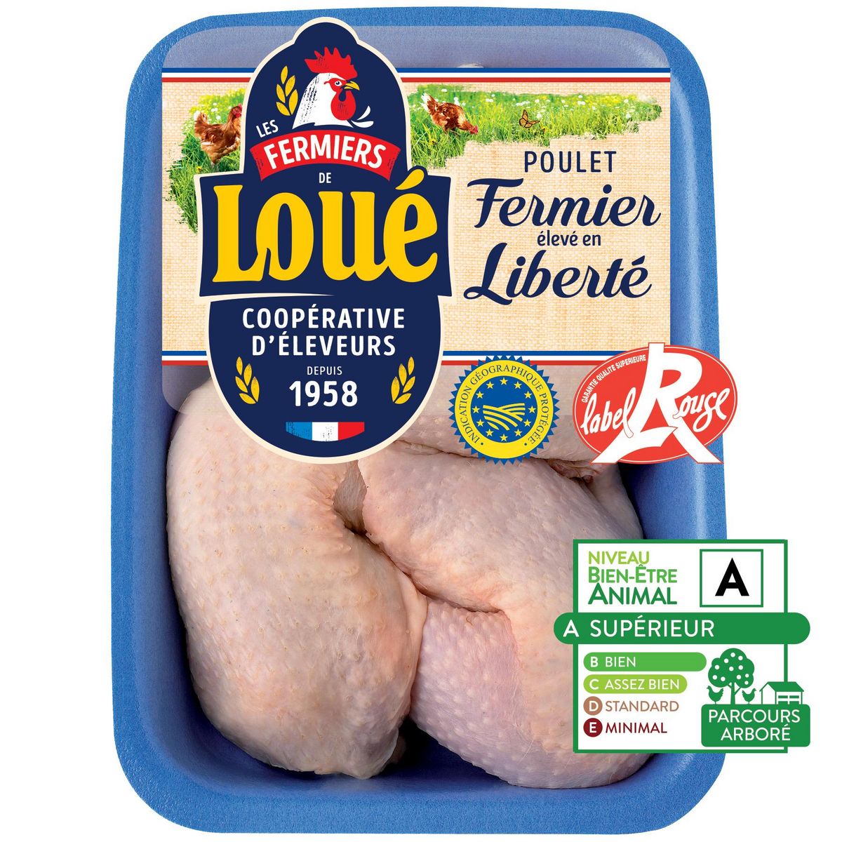 De généreuses cuisses de poulet fermier de Loué Label Rouge. Des cuisses savoureuses qui reflètent le mode d'élevage unique du poulet de Loué : élevé en liberté, nourri aux céréales locales. Elles se prêteront à de multiples recettes : en cocotte ou au four, marinées, juste rôties ou cuisinées à la basquaise.