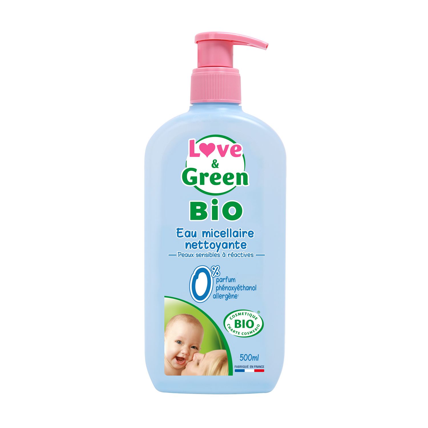 Fabriqué en France, l’eau micellaire nettoyante Love & Green est certifiée BIO par ECOCERT. Ce produit nettoie la peau de toute la famille. Son utilisation sans rinçage permet de nettoyer et d'apaiser en douceur le visage, les mains et les fesses de bébé. Sans parfum, elle est conçue pour toutes les peaux, même les peaux sensibles à réactives.