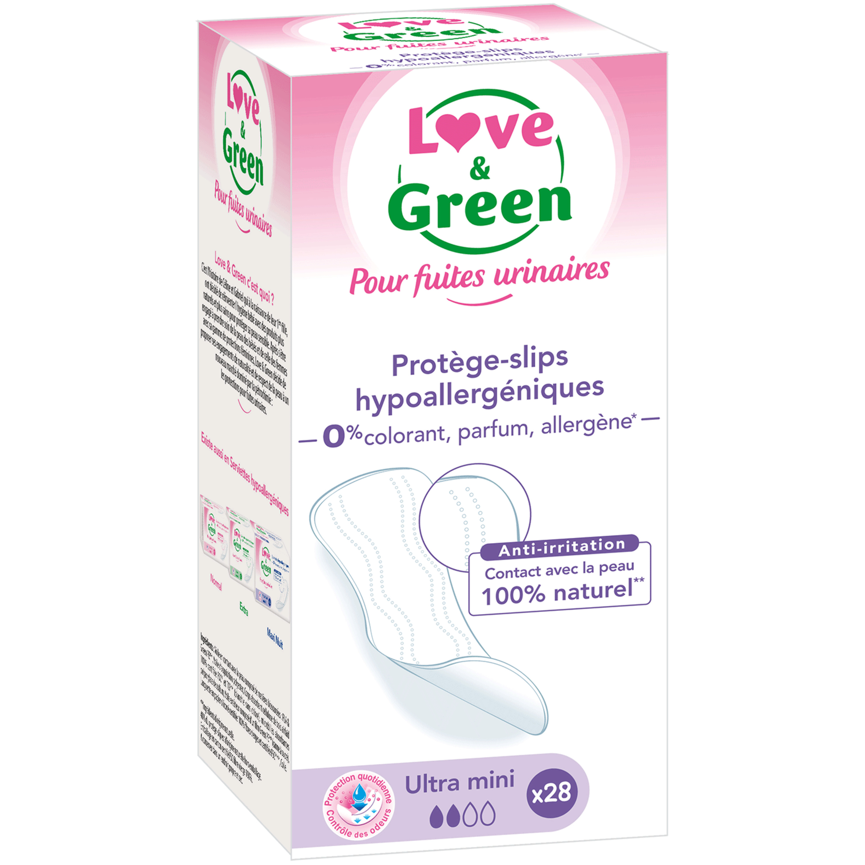 "Les protège-lingeries pour fuites urinaires ULTRA MINI Love & Green sont anti-irritation et plus respectueux de votre corps. Le voile en contact avec la peau est d’origine naturelle, sans lotion chimique ni colorant. Ils allient douceur et efficacité optimale grâce au coussin qui est composé de cellulose non blanchie au chlore et de microbilles ultra absorbantes. Les protège-lingeries ULTRA MINI offrent une protection maximale contre les fuites urinaires légères.