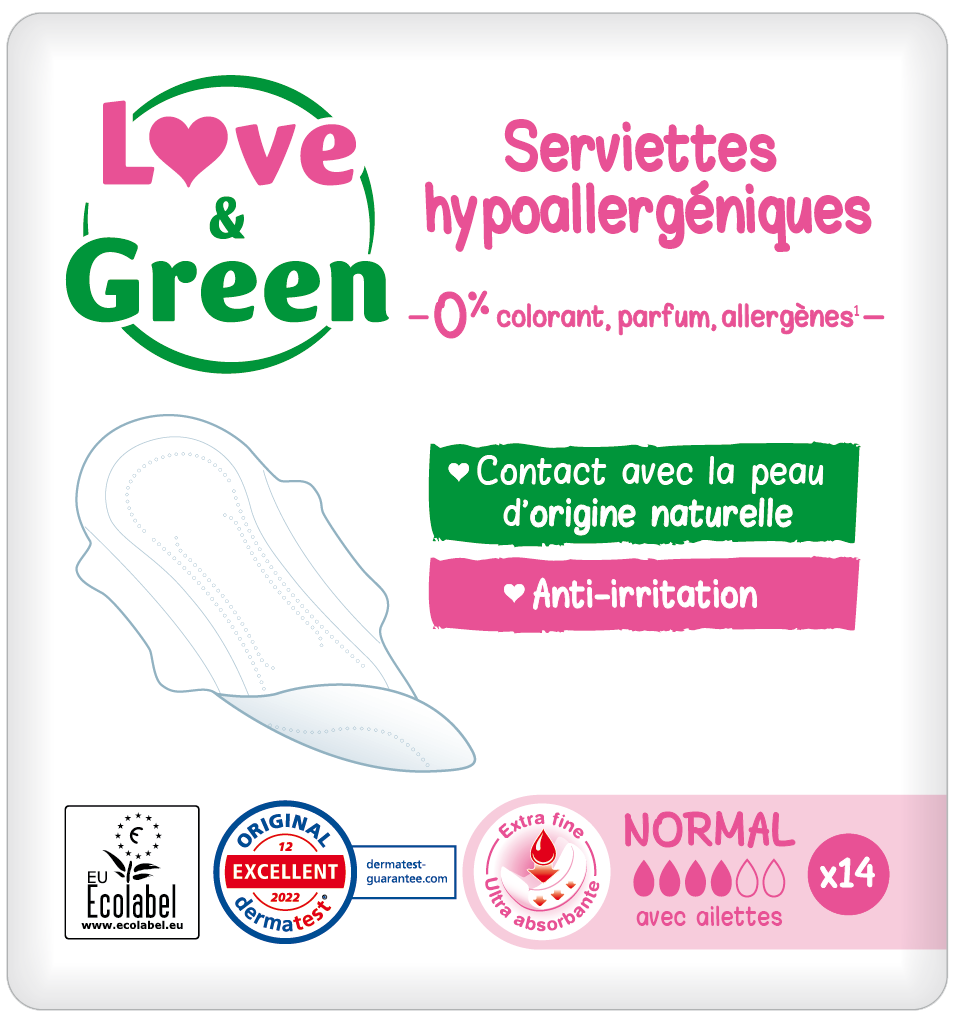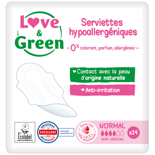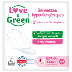 Les serviettes hypoallergéniques ULTRA Love & Green vous garantissent une protection optimale pendant vos règles ! Sans ingrédient indésirable suspecté d'être cancérigène ou perturbateur endocrinien, elles possèdent un voile en contact avec la peau ultra doux et d'origine naturelle. Extra-fines, toutes douces et ultra-absorbantes elles vous offrent un maximum d’efficacité et de confort tout en respectant votre zone intime. Les serviettes hypoallergéniques ULTRA NORMAL conviennent pour des flux légers à moyens.