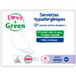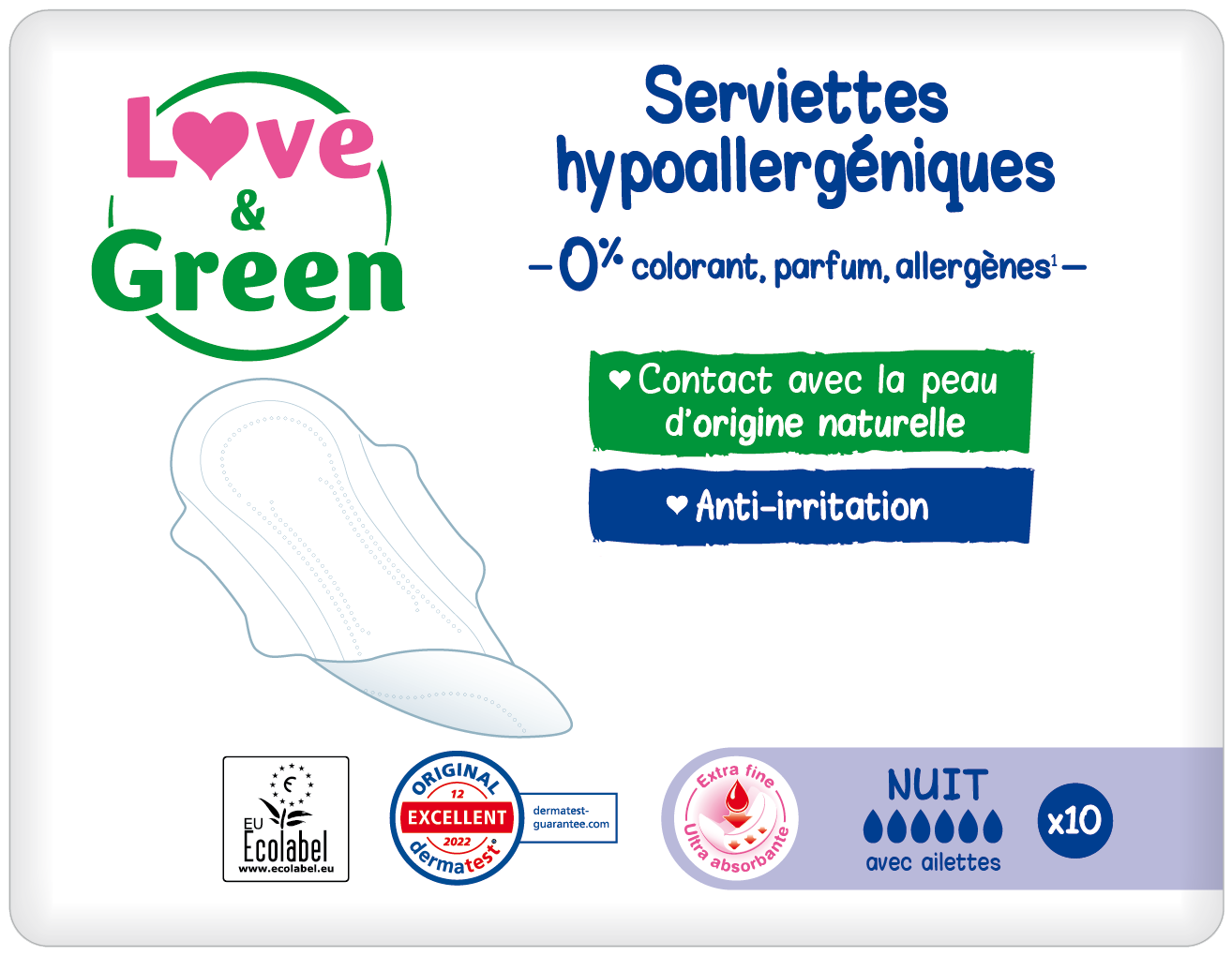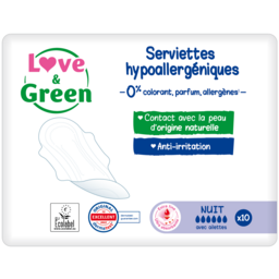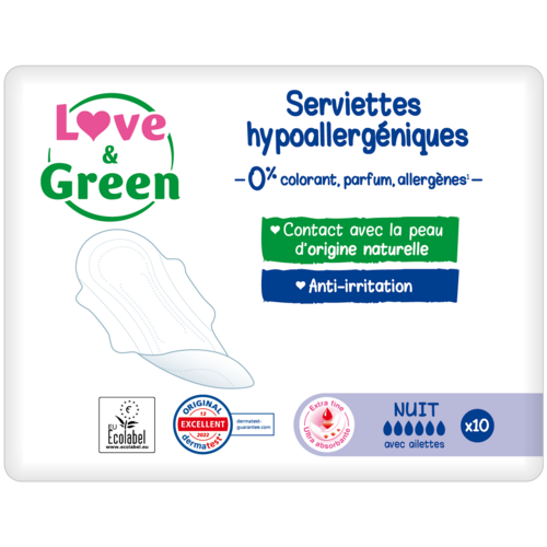Les serviettes hypoallergéniques ULTRA Love & Green vous garantissent une protection optimale pendant vos règles ! Sans ingrédient indésirable suspecté d'être cancérigène ou perturbateur endocrinien, elles possèdent un voile en contact avec la peau ultra doux et d'origine naturelle. Extra-fines, toutes douces et ultra-absorbantes elles vous offrent un maximum d’efficacité et de confort tout en respectant votre zone intime. Les serviettes hypoallergéniques ULTRA NUIT conviennent pour des flux légers à moyens la nuit.