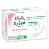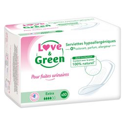 "Les serviettes pour fuites urinaires EXTRA Love & Green vous offrent une protection optimale et plus naturelle au quotidien ! Le voile en contact avec la peau est d’origine naturelle, sans lotion chimique ni colorant. Elles allient douceur et efficacité optimale grâce au coussin qui est composé de cellulose non blanchie au chlore et de microbilles ultra absorbantes. Les serviettes EXTRA offrent une protection maximale pour les fuites urinaires modérées.