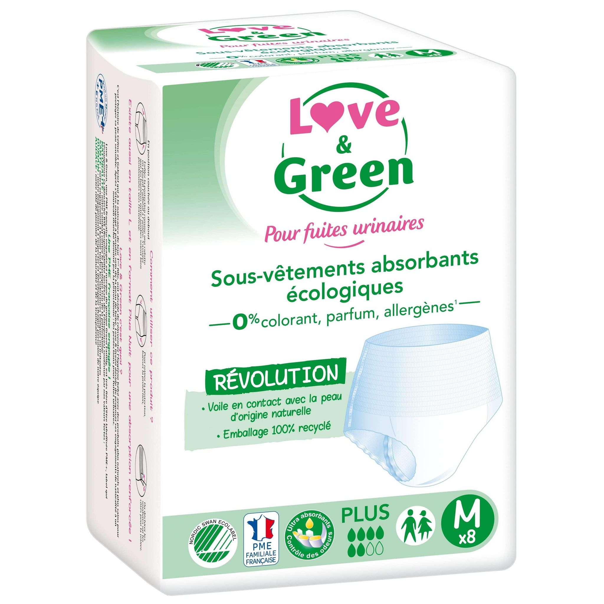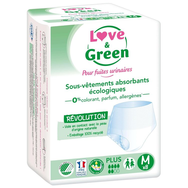 Les sous-vêtements absorbants écologiques PLUS Love & Green vous offrent une protection ultra discrète, confortable et plus naturelle ! Le voile en contact avec la peau est 100% d’origine naturelle, sans lotion chimique ni colorant. Pour une protection