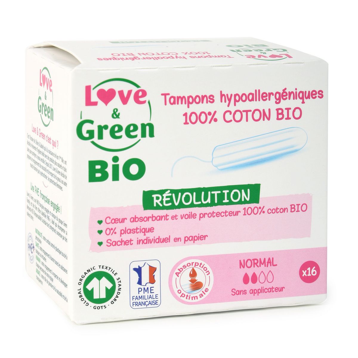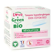 "Les tampons sans applicateur Love & Green sont 100% en coton BIO et certifiés GOTS par Ecocert. Ils sont respectueux de votre zone intime sans aucun ingrédient indésirable. Ils sont tous doux pour l’environnement avec un sachet individuel en papier. Les tampons 100% coton Bio sans applicateur NORMAL offre une protection maximale pour les flux légers à modérés.