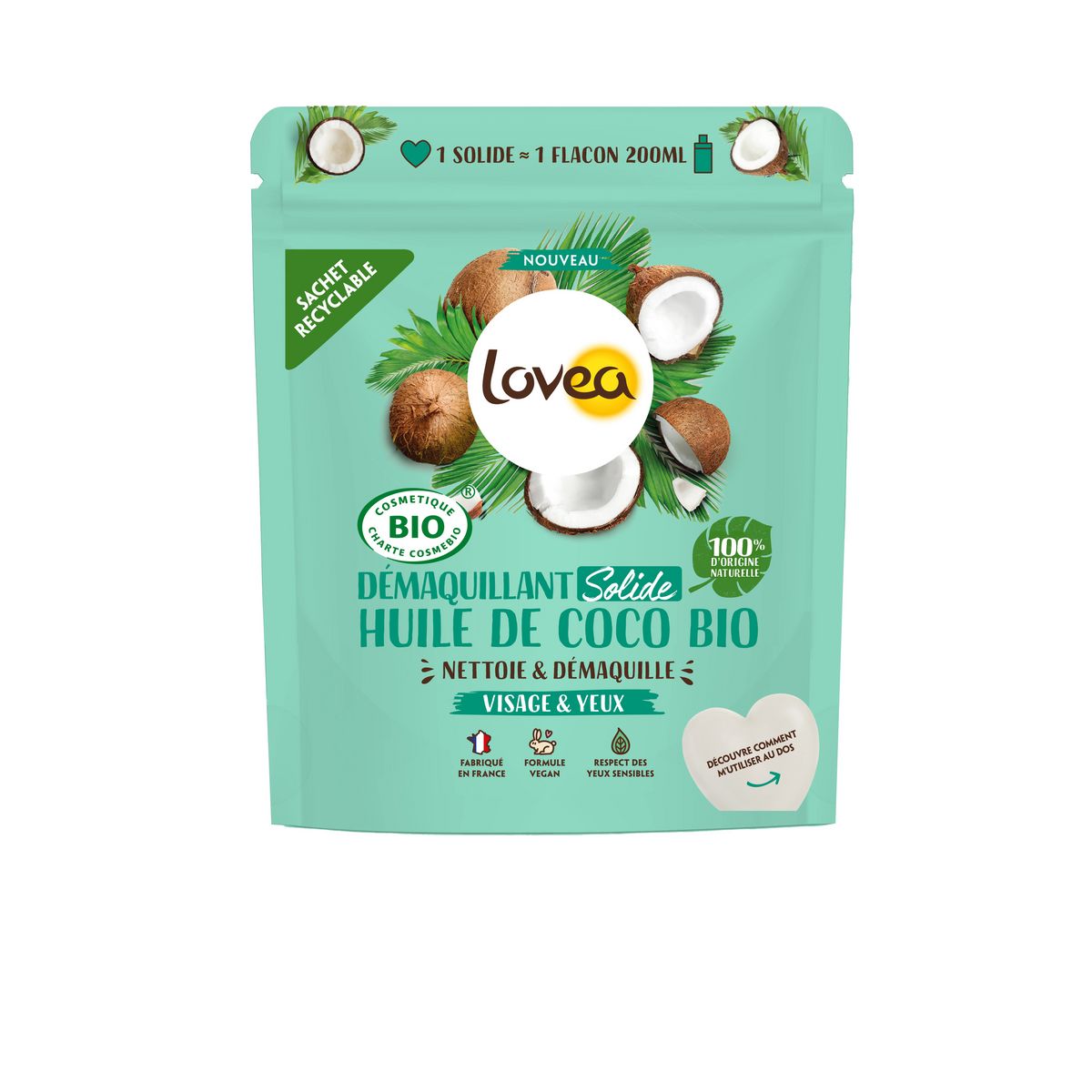 Le démaquillant Solide à l' Huile de Coco BIO LOVEA nettoie et démaquille le visage et les yeux sans aucun fini gras ou collant. Sa texture unique se transforme en un voile lacté tout doux au contact de l'eau pour éliminer le maquillage sans piquer les yeux. Résultat . La peau est douce et démaquillée. Les yeux sensibles sont respectés.