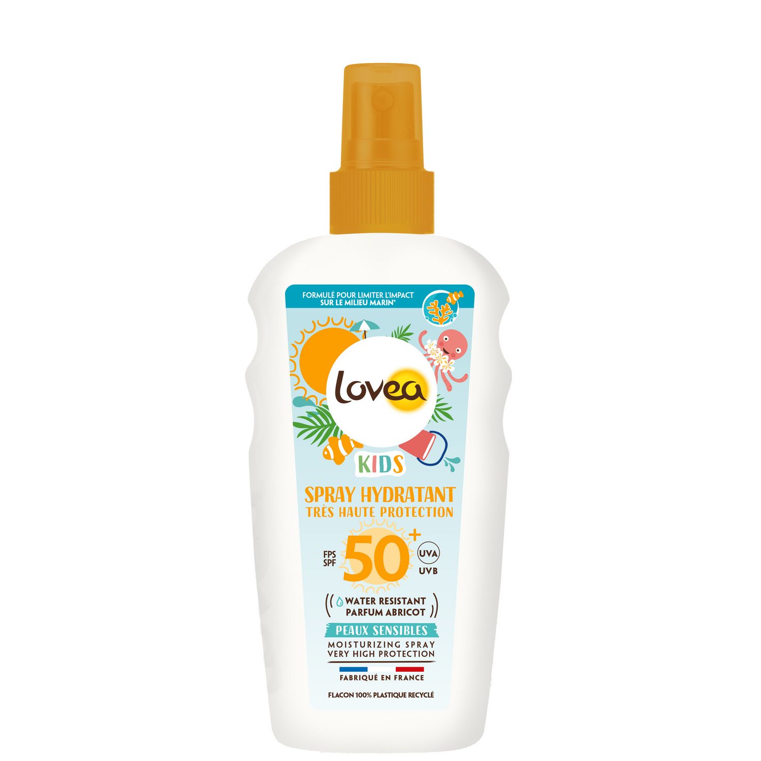 Le spray hydratant FPS 50+ kids Lovea contient de nouveaux filtres solaires choisis avec soin pour un plus grand respect de la peau de votre enfant ! Sa formule très haute protection protège immédiatement et efficacement la peau sensible des enfants des rayons UVA et UVB. Sa texture fluide et non-collante au délicieux parfum d’abricot s’applique facilement et résiste à l’eau. Souriez, votre enfant est protégé en toutes circonstances !