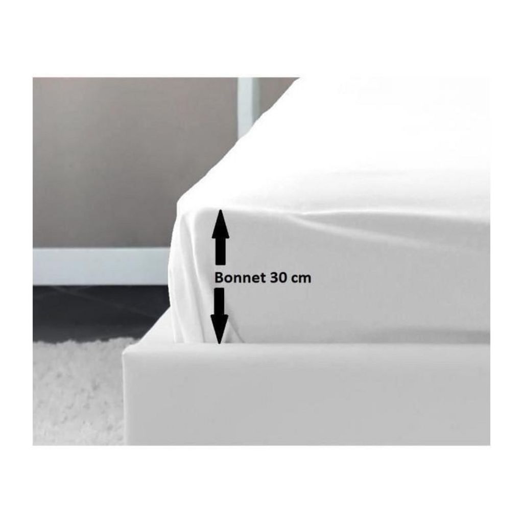 Drap housse 100% coton tissé serré 54 fils de coloris blanc. Avec bonnet de 30 cm. Pour lit 2 personnes. Lavable en machine a 40°C. Certifié oeKO-TEX. Dimensions : 140x190 cm.
