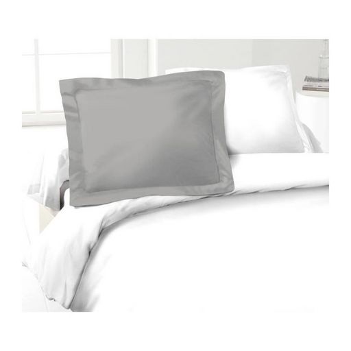 Lot de 2 Taies d'Oreillers 100% coton tissé serré 54 fils de coloris gris clair. Volant plat piqué. Lavable en machine a 40°C. Certifié oeKO-TEX. Dimensions : 50x70 cm.