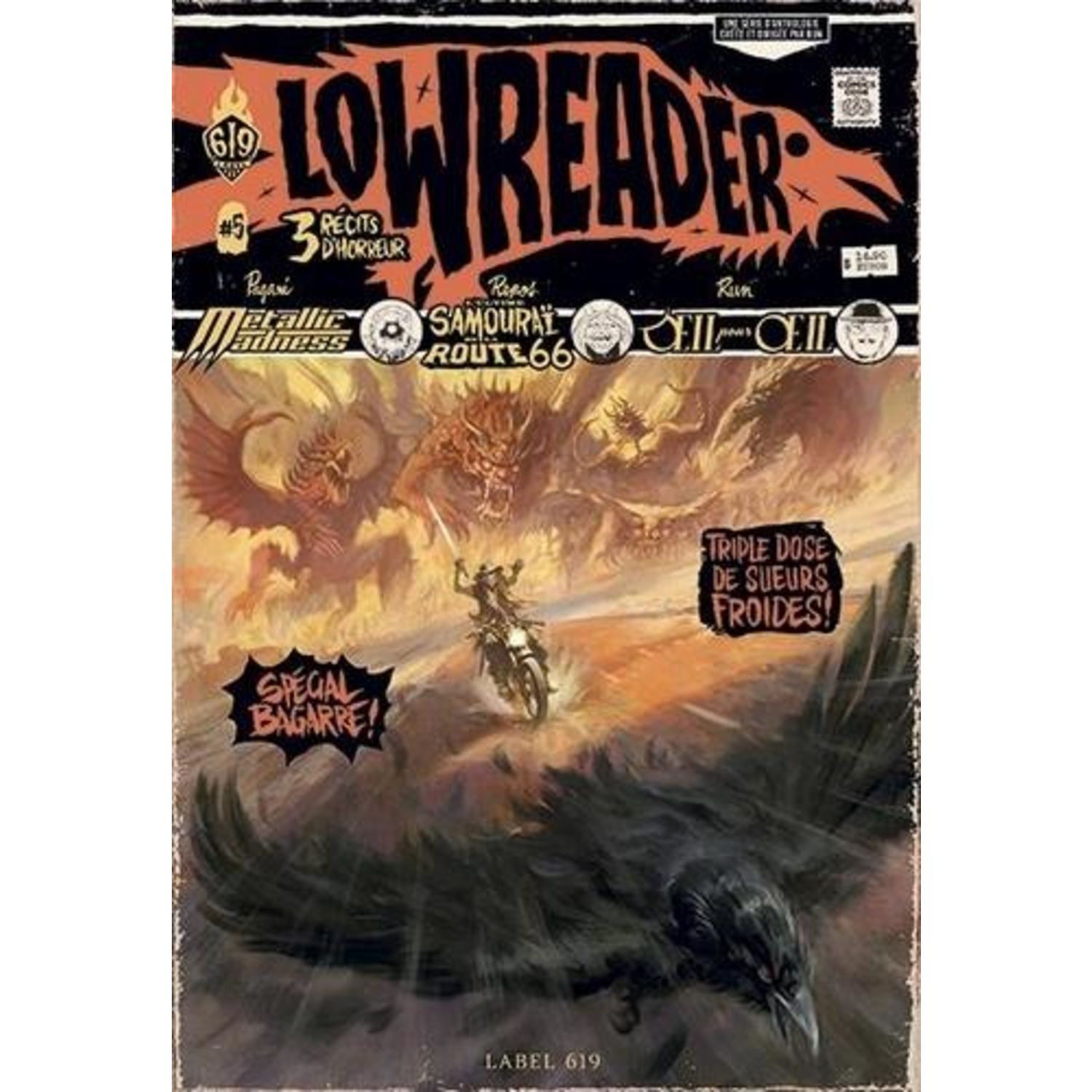 LowReader est une série d'anthologie d'histoires courtes de suspense, d'horreur et d'exploitation, dirigée par Run. Chaque numéro propose trois histoires complètes. Suivez le corbeau ! - Oeil pour oeil, RUN - L'Ultime samouraï de la route 66, par Sylvain Repos - Metallic Madness, par Baptiste Pagani
