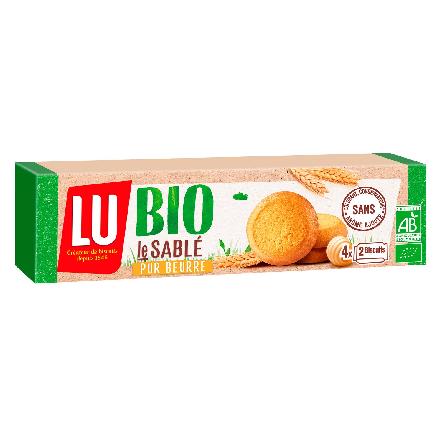 Biscuits sablés au beurre. LU lance LU Bio, tout le savoir faire de LU dans des recettes simples et gourmandes, avec des ingrédients de qualité issus de l’agriculture biologique. Découvrez le biscuit Sablé LU Bio, un sablé gourmand et fondant 100% pur beurre. Contient 4 sachets de 2 biscuits : pratique à emporter ! Le biscuit Sablé LU BIO c'est aussi : - aucun colorant, aucun conservateur ni arôme ajouté - fabriqué avec des œufs de poules élevées en plein air - fabriqué avec du sucre de canne - un pack carton recyclable