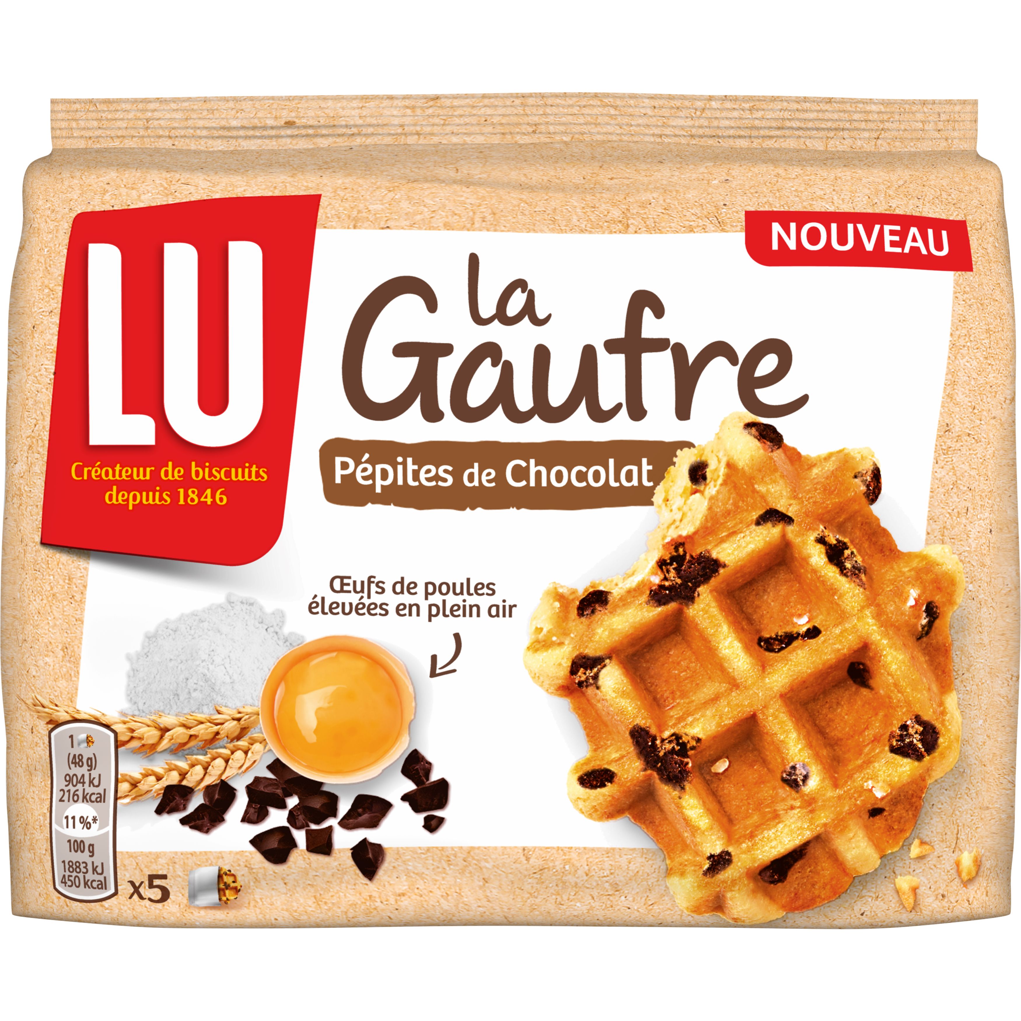 Farine de BLÉ 33%, perles de sucre 22%, margarine [huile de colza, huile de palme, eau, sel, émulsifiants (E471, lécithines), régulateur d'acidité (E330), arôme], pépites de chocolat noir 12% [pâte de cacao, sucre, dextrose, émulsifiant (lécithines de SOJA)], OEUFS entiers 6%, BEURRE concentré, levure, LAIT entier, sirop de sucre inverti, stabilisant (sorbitol), farine de SOJA, sel, arômes.