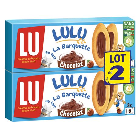 Lulu La Barquette aux chocolat noisette et lait écrémé, un tendre et délicieux gâteau pour le goûter des enfants. Lot de 2 paquets, chacun contenant 3 sachets fraîcheur.