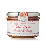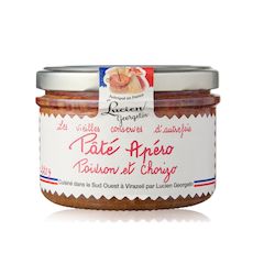 Gorge de porc*, viande de porc*, viande de canard*, chorizo 8,6% (viande de porc**, sel, LACTOSE , piments, dextrose, épices et plantes aromatiques, colorant : carmins, anti-oxydant : érythorbate de sodium, conservateur : nitrite de sodium, ferments), échalote, bouillon de volaille (eau, carcasses de volailles, oignon, sel, poivre), poivron 6,5%, foie de porc, épices à chorizo (épices, sel, dextrose, plantes aromatiques, arômes de fumée), sel, ail, gélatine de porc, rhum (rhum, sel, arôme naturel), poivre. *Origine : France - ** origine UE