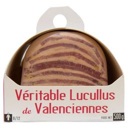Ingrédients : Langue de bœuf traitée en salaison et fumée 46% (langue de bœuf origine France, sel, conservateur (nitrite de sodium)), foie gras de canard origine UE, graisse de canard, foie maigre de canard, eau, OEUF, Armagnac, protéines de LAIT, sel, sucre, poivre, gélatine de bœuf, antioxydant (acide ascorbique), conservateur (nitrite de sodium). Fabriqué dans un atelier manipulant du gluten