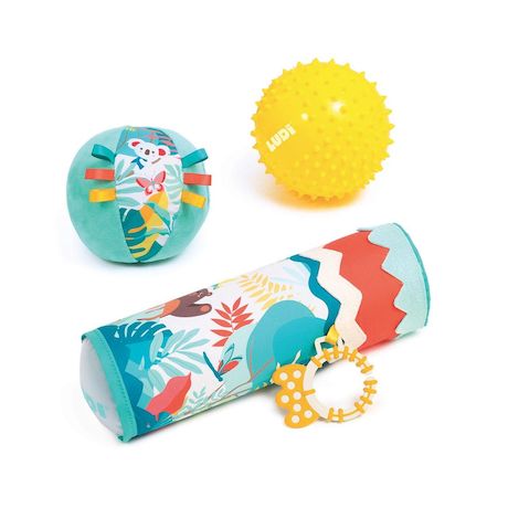Rires et sensations assurés !. Adapté pour les enfants à partir de 6 mois, ce coffret sensoriel propose un éventail de jeux d'éveil rigolos et débordants de couleur !. Le coffret est composé d'une balle sensorielle à picots, d'un rouleau gonflé et d'une balle en tissus doux. Tout pour amuser bébé et mettre ses sens en éveil !. La balle à picots stimule les sens du toucher et la dextérité. Ses picots soulagent les petites dents de bébé. Elle est idéale pour les massages ou les parties de chatouilles ! La balle en tissu est composée de nombreuses textures douces et d'un florilège de rubans de couleurs. Confortable, bébé adore s'appuyer dessus. De belle taille, le rouleau gonflé donne aux tout-petits l'impression d'être forts comme les grands ! Son fourreau en tissu est déhoussable et lavable. Retrouvez-y un joli décor de la jungle et des animaux, des feutrines en zigzag et un anneau de dentition. Un grelot à l'intérieur du tube attire l'attention et stimule la curiosité de bébé. Ce gros hochet peut faire guise de bâton de pluie !. En voiture ou en poussette, le tube peut accompagner bébé dans tous les déplacements de la famille. Il se fixe facilement sur un support à l'aide de son anneau. Les jouets sensoriels sont parfaitement adaptés pour faciliter la prise en main et stimulent les sens de bébé. Coffret adapté pour les enfants à partir de 6 mois. Dimensions du tube sensoriel : longueur 30 cm, diamètre ø 10 cm. Fourreau composé de : 100% polyester. Lavable en machine à froid. Tube composé à 100 % de PVC. Lavable avec un chiffon humide. Composition de la balle jaune à picots : 100% PVC. Lavable avec un chiffon humide. Dimension : ø 13 cm. Composition de la balle en tissu : 100 % polyester. Lavable à grande eau à la main à froid. Dimension : ø 13 cm.