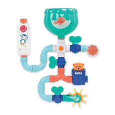 Un grand circuit d'eau rigolo à construire !. Ce jeu de construction aquatique est plein d'astuces pour animer l'heure du bain ! Retrouvez tout un réseau de tuyaux équipés de robinets et de nombreuses activités pour découvrir les effets de l'eau. Il est impossible de s'ennuyer !. Quand l'enfant verse l'eau dans le réservoir et ouvre les robinets, tout le circuit s'active !. Bébé s'amusera à regarder la bille monter dans la capsule et indiquer le niveau de l'eau. Il jouera avec l'eau entrainant le moulin et se laissera volontiers arroser par la petite fleur. Accompagnés de leurs parents, les enfants pourront également fermer un des trois robinets pour que l'activité associée cesse de fonctionner. Par le jeu, ils apprendront qu'une action peut en entraîner une autre. Un jeu évolutif. Les 16 pièces sont interchangeables et permettent aux enfants de réaliser leur propre parcours. En grandissant, ils adoreront réfléchir et trouver des installations insolites pour tester leur circuit d'eau. Place à l'imagination !. À l'aide des ventouses, il est facile de fixer le circuit sur les parois de la baignoire ou sur le carrelage. Solide et pratique il peut aussi se détacher pour devenir un jouet indépendant. Adapté pour les enfant de plus de 18 mois. Contenu du pack : 1 réservoir avec ventouses + 1 adaptateur + 3 robinets + 6 coudes+ 1 double coude + 1 capsule transparente avec bille à niveau + 1 moulin + 1 pomme d'arrosoir + 1 ourson + 1 cuillère. Composition : Acrylonitrile Butadiène Styrène (ABS). Égoutter les jouets après utilisation et rincer/laver à l'eau claire régulièrement.