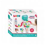 Un grand circuit d'eau rigolo à construire !. Ce jeu de construction aquatique est plein d'astuces pour animer l'heure du bain ! Retrouvez tout un réseau de tuyaux équipés de robinets et de nombreuses activités pour découvrir les effets de l'eau. Il est impossible de s'ennuyer !. Quand l'enfant verse l'eau dans le réservoir et ouvre les robinets, tout le circuit s'active ! Galoppin le petit lapin plongeur indique la direction de l'eau qui s'écoule. Les 14 pièces sont interchangeables et permettent aux enfants de réaliser leur propre parcours. En grandissant, ils adoreront réfléchir et trouver des installations insolites pour tester leur circuit d'eau. Place à l'imagination !. Ludique, ce jeu rigolo captive le regard des petits. Une belle occasion pour les enfants d'affiner leur dextérité, de développer leur sens de l'observation, la compréhension de cause à effet et leur vocabulaire !. À l'aide des ventouses, il est facile de fixer le circuit sur les parois de la baignoire ou sur le carrelage. Solide et pratique il peut aussi se détacher pour devenir un jouet indépendant. Adapté pour les enfant de plus de 18 mois. Contenu du pack : 1 réservoir avec ventouses + 1 connecteur + 3 robinets + 6 tuyaux+ 1 capsule transparente avec bille à niveau + 1 moulin + 1 fleur « pomme d'arrosage ». Composition : Acrylonitrile Butadiène Styrène (ABS). Dimension : 13 x 13 x 9,5 cm. Égoutter les jouets après utilisation et rincer/laver à l'eau claire régulièrement.