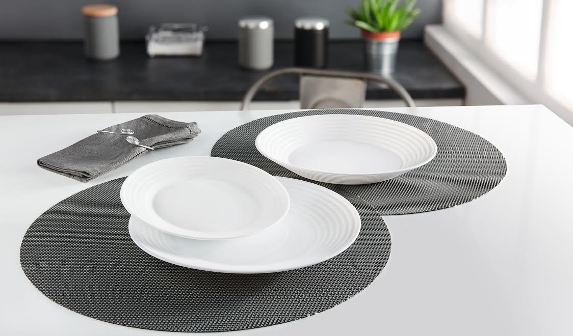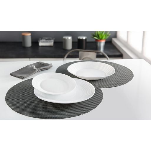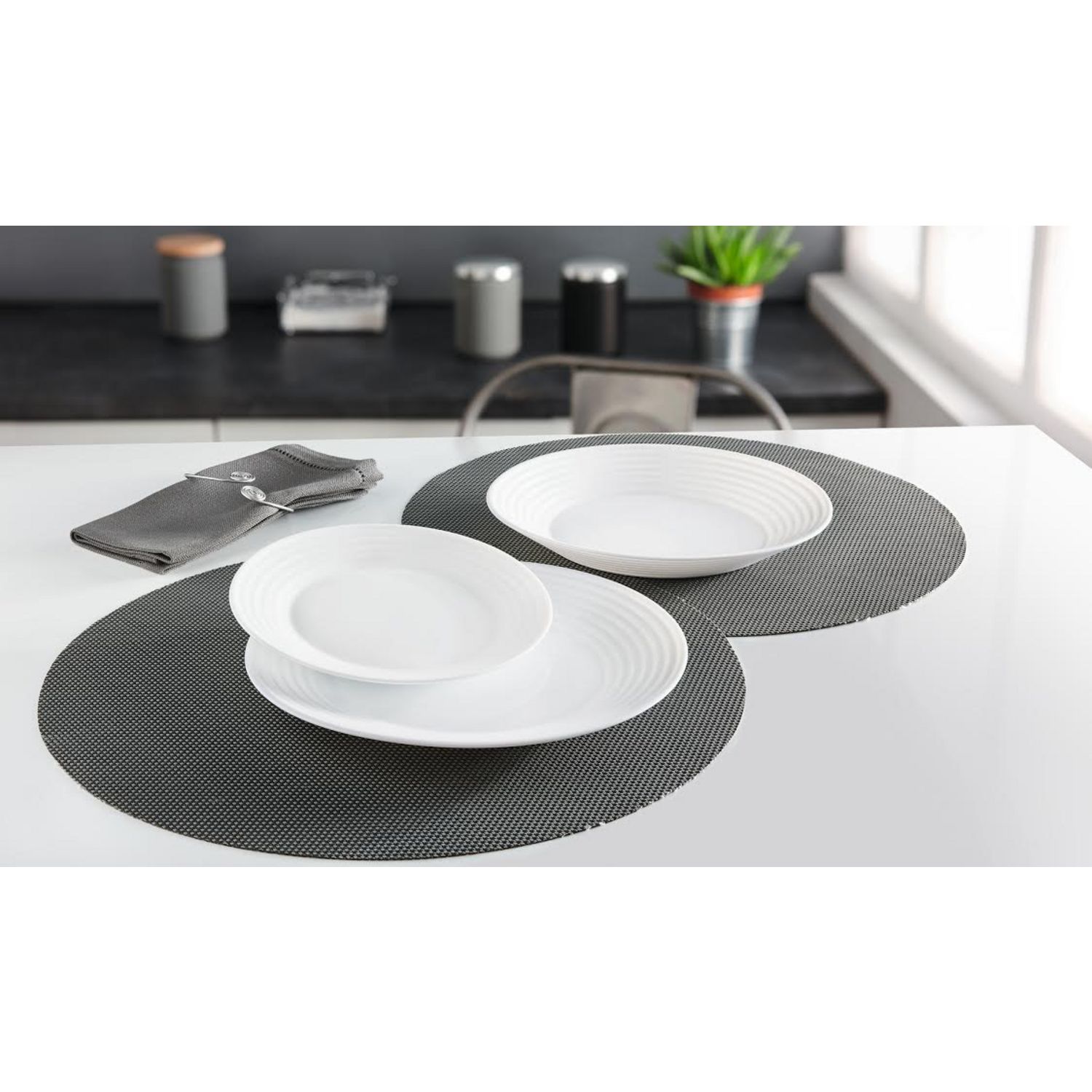 Découvrez ce service d'assiettes composé de 18 pièces. Des assiettes qui évoquent la forme des arènes de cirque, avec des gradins étagés sur les ailes. La collection Harena parade sur votre table familiale. Les anneaux suggestifs créent un décor ludique qui contrarie la sobriété du blanc immaculé de l’opale. Ce service est fabriqué en opale trempé : vous êtes sûr de sa résistance aux chocs, supérieure à la porcelaine, et de sa longévité. Zéro mauvaise odeur, zéro coloration par les aliments, zéro rétention de bactéries, 100% sain.