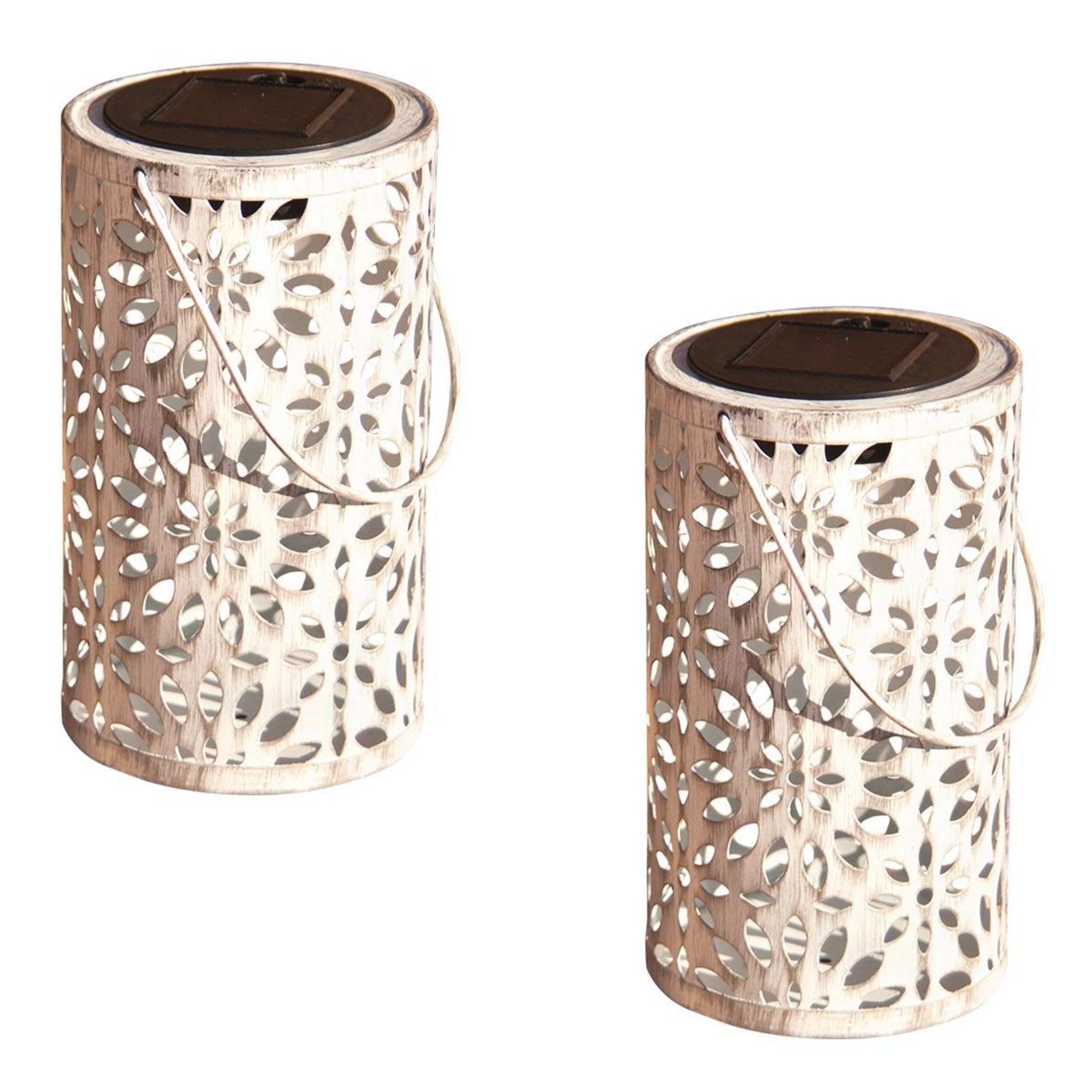 LAMPE DE TABLE SOLAIRE LED : 2x Bloom est un lot de 2 lanternes solaires à base LED blanc froid qui possède jusqu'à 6 heures d'autonomie de fonctionnement. Designs et originales elles apporteront une touche chaleureuse à votre décoration avec leurs ombres en forme de fleurs. Le lot de lampes solaires en métal vieilli, 2x Bloom est idéal comme lampe de table design, lampe de chevet ou veilleuse pour enfant ou encore pour éclairer tous vos mariages, anniversaires et autres réceptions. À vous de choisir !