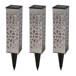 BALISE SOLAIRE LED : Organic INOX est un lot de 3 balises solaires à base LED blanc chaud qui possède jusqu'à 7 heures d'autonomie de fonctionnement. Original avec son style oriental, ses belles ombres portées et sa fonction 2 en 1 (à piquer ou à poser), il balisera votre extérieur avec goût. L'écl
