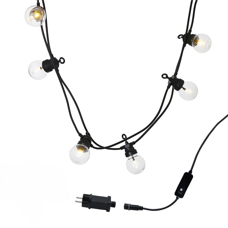 - ROBUSTE : ainsi, la guirlande lumineuse LED Party Clear 20 design d'une longueur totale de 8.70m composée de 20 ampoules rondes transparentes est protégée contre les éclaboussures (IP44) et résiste aussi aux UV. Il y a 30cm entre chaque ampoule et 3m de la prise à la première ampoule.