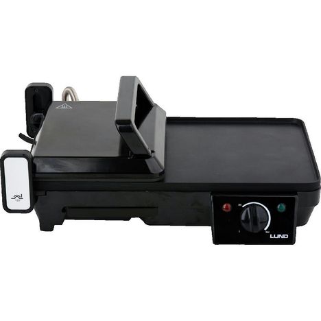Découvrez le barbecue électrique Lund 67455, un appareil de cuisson performant avec une puissance de 2000W. Il est idéal pour griller viandes, poissons, légumes et toasts grâce à ses plaques réglables qui assurent une cuisson optimale. Construit en acier inoxydable avec un revêtement antiadhésif, il est facile à nettoyer. Compact et léger, ce grill offre trois modes de grillade (fermé, ouvert à 90°, ouvert à 180°) pour une expérience culinaire polyvalente. Il dispose également d'un bac de récupération, d'une température réglable, d'une poignée non chauffante, et d'indicateurs d'alimentation et de préparation. Ses dimensions de plaques sont 40,5 x 25 cm pour la grande et 18 x 24,5 cm pour la petite, avec une surface de cuisson fermée de 1012,5 cm² et ouverte de 1453,5 cm². Le câble mesure 80 cm et le poids est de 4.25 kg.