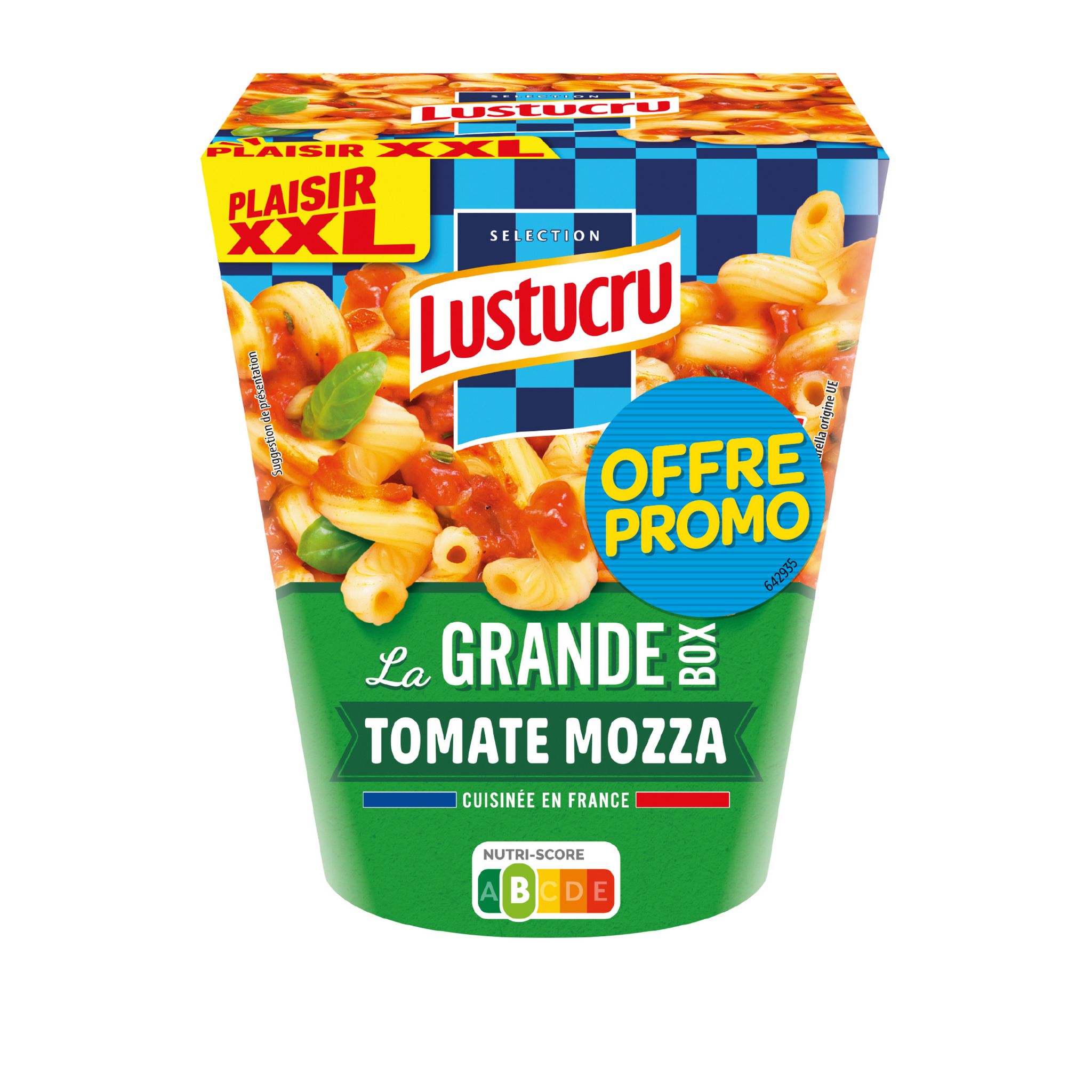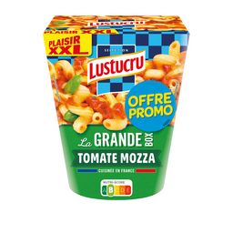 Ingrédients : Tomate pulpe 28.8%, pâte alimentaire (GLUTEN) 27.2%, eau, CREME légère UHT (stabilisant : carraghénanes), MOZZARELLA (LAIT de vache pasteurisé, sel, ferments lactiques, coagulant, acide citrique) 2.4%, oignons 2.2%, tomate purée 2.1%, huile de colza, huile d'olive vierge extra, basilic 0.8%, sucre, sel, amidon transformé, ail, épaississant : gomme xanthane, émulsifiant : lécithine de SOJA, extrait d'épice, conservateurs : sorbate de potassium-acétate de sodium, thym déshydraté, arôme naturel (LAIT). Informations en majuscules destinées aux personnes allergiques. Peut contenir des traces d'œufs, de poisson, crustacés, sésame et fruits à coque. Conditionné sous atmosphère protectrice.
