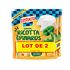 Ingrédients :Farce 60% (Epinards cuits 20% (épinards 17%, BEURRE pasteurisé, échalote, ail), RICOTTA 15%, pommes de terre déshydratées-épice : curcuma, huile de colza, eau, FROMAGE à pâte dure, amidon, semoule de BLE dur, LACTOSERUM (LAIT), fibres de BLE, sel, ciboulette, sucre, noix de muscade, arôme naturel), Pâte 40% (semoule de BLE dur, ŒUFS frais issus de poules élevées en Plein Air 8.4%, eau). Pourcentages exprimés sur le produit total.Peut contenir des traces de soja et moutarde.Conditionné sous atmosphère protectrice.