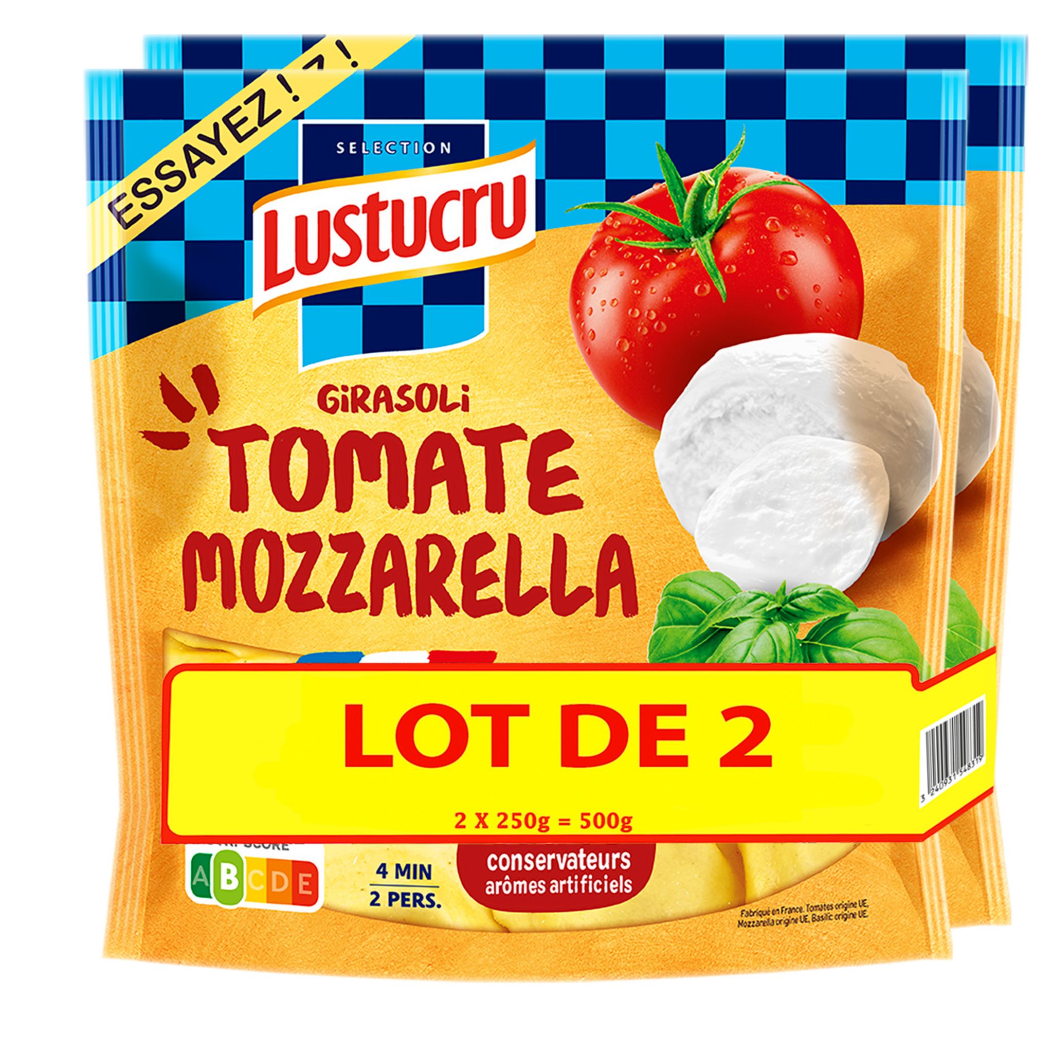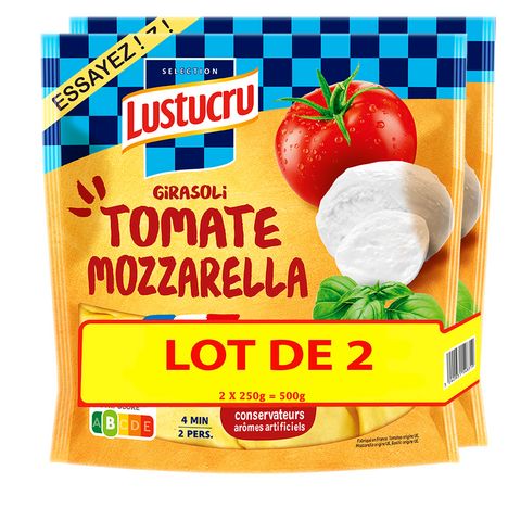 Ingrédients : Farce 60% (tomate purée 12.6%, CREME FRAICHE (LAIT), MOZZARELLA 6%, RICOTTA, pommes de terre déshydratées-épice : curcuma, basilic 3.8%, eau, LACTOSERUM, amidon, MASCARPONE, semoule de BLE dur, cuisson sofrito (huile de colza et/ou tournesol, oignons, ail), huile d'olive vierge, sucre, sel, fibres de BLE, oignon déshydraté, thym), Pâte 40% (semoule de BLE dur, ŒUFS frais issus de poules élevées en Plein Air 8.4%, eau). Pourcentages exprimés sur le produit total.Peut contenir des traces de soja, moutarde et gluten provenant d'autres céréales.Conditionné sous atmosphère protectrice.