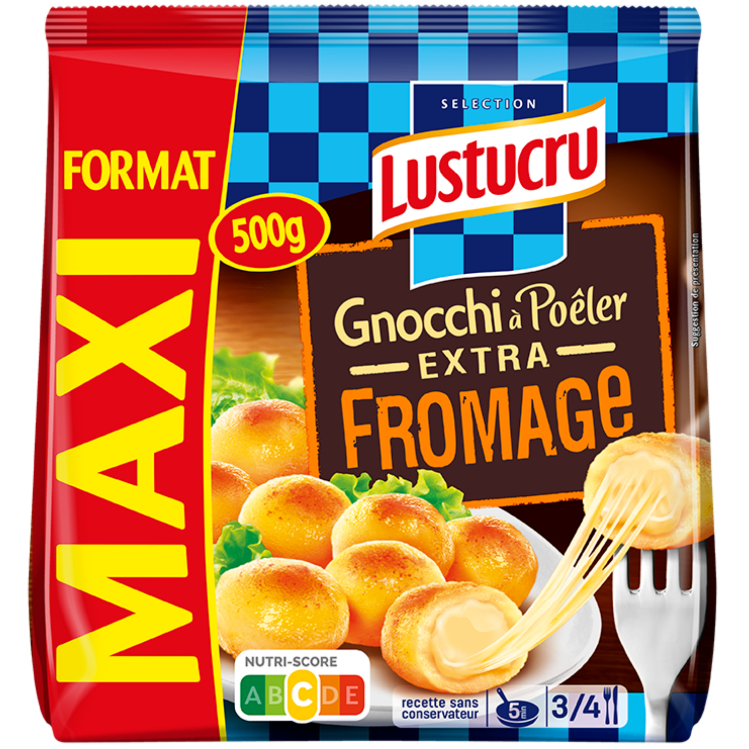 Comment résister à un Gnocchi à Poêler Extra Fromage Lustucru ? Croustillant à l'extérieur, avec son cœur de fromage EXTRA fondant… Toute la famille va en raffoler ! Un format Maxi pour un Maxi plaisir. Une recette garantie sans conservateur.