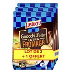 Ingrédients : Pâte à gnocchi 70.3% (eau, semoule de BLE dur, flocons de pomme de terre (pommes de terre déshydratées, épice : curcuma, huile de colza, sel), Garniture 26.8% (EMMENTAL (LAIT, sel, ferments lactiques, coagulant) 5.6%, MOZZARELLA (LAIT de vache pasteurisé, sel, ferments lactiques, coagulant, acide citrique) 5.6%, FROMAGE FRAIS 5.6%, RICOTTA (LACTOSERUM, LAIT, sel, correcteurs d'acidité : acide citrique, acide lactique) 2.7%, huile de colza, flocons de pomme de terre (pommes de terre déshydratées, épice : curcuma), COMTE AOP 1.5%, amidon transformé, semoule de BLE dur, arômes (LAIT), sel, Enrobage : farine de BLE dur. Pourcentages exprimés sur le produit total. Informations en majuscules destinées aux personnes allergiques. Peut contenir des traces d’œufs et fruits à coque. Conditionné sous atmosphère protectrice.
