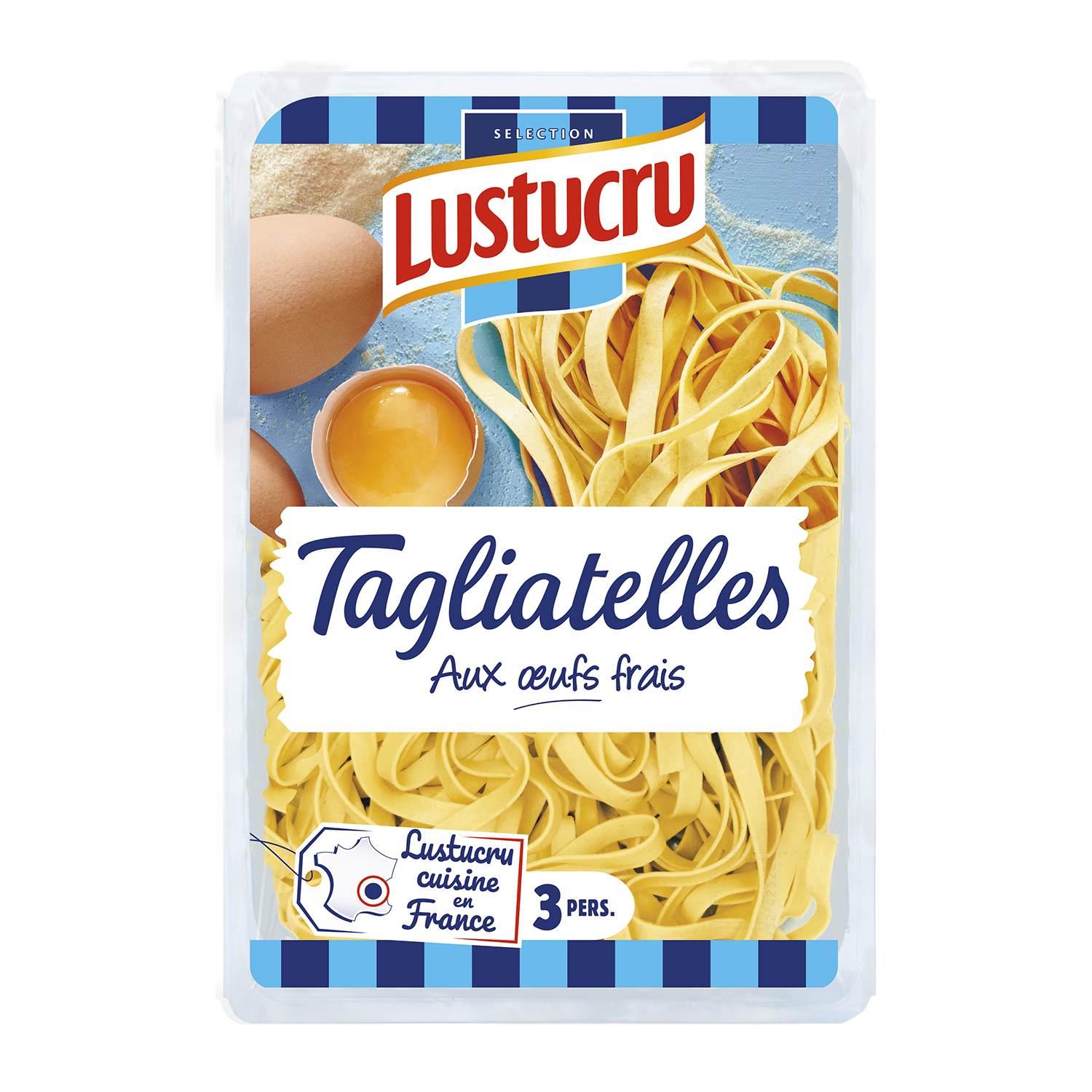 Ingrédients : Semoule de BLE dur de qualité supérieure, eau, ŒUFS frais 10,3% (soit 140g d'œufs/kg de semoule), sel. Informations en majuscules destinées aux personnes allergiques. Conditionné sous atmosphère protectrice.