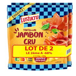 Pâte 64% (semoule de BLE dur, ŒUFS frais issus de poules élevées en Plein Air 13,5%, eau), Farce 36% (Jambon cru (jambon de porc*, sel) 6,1%, eau, chapelure (farine de BLE, eau, sel, levure), CREME FRAICHE 4,4%, pommes de terre déshydratées-épice: curcuma, FROMAGE à pâte dure, LACTOSERUM (LAIT), huile de colza et/ou tournesol, arômes naturels (BLE, LAIT), BEURRE pasteurisé, sel, basilic, poivre, noix de muscade). Pourcentages exprimés sur le produit total. Peut contenir des traces de soja, moutarde et gluten provenant d'autres céréales. *Viande de porc origine : UE. Conditionné sous atmosphère protectrice.