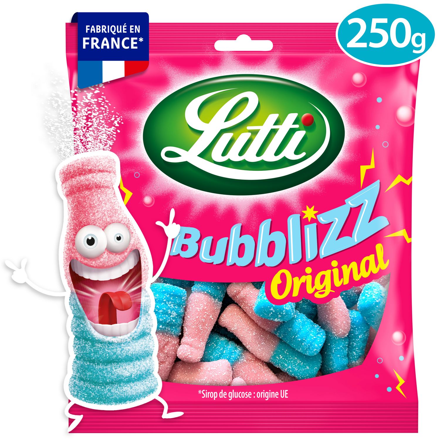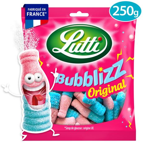 Découvre Bubblizz de Lutti, l'originale bouteille rose et bleue pétillante au surprenant goût de Bubble Gum. Avec Bubblizz, tu vas pétiller de plaisir !
