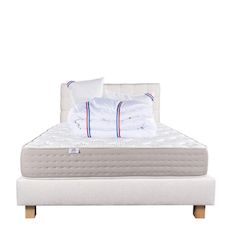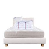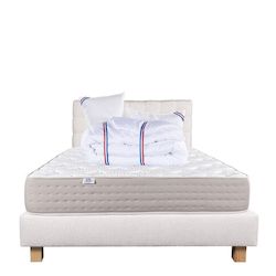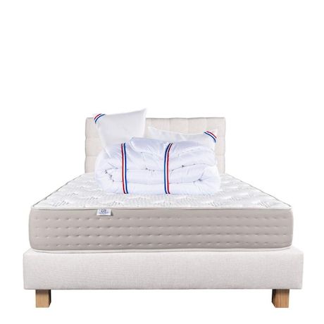 Ce matelas est constitué de différentes couches de mousse haute densité et la technologie des ressorts. Nous avons souhaité le combiner avec une couette de 450g avec une très bonne régulation thermique, elle possède un bon gonflant avec un toucher soyeux ainsi qu'un oreiller en 60x40cm avec un garnissage 100% mousse viscoélastique. Pour compléter ce pack nous avons selectionné notre sommier tapissier en bois massif, ainsi que la tête de lit.