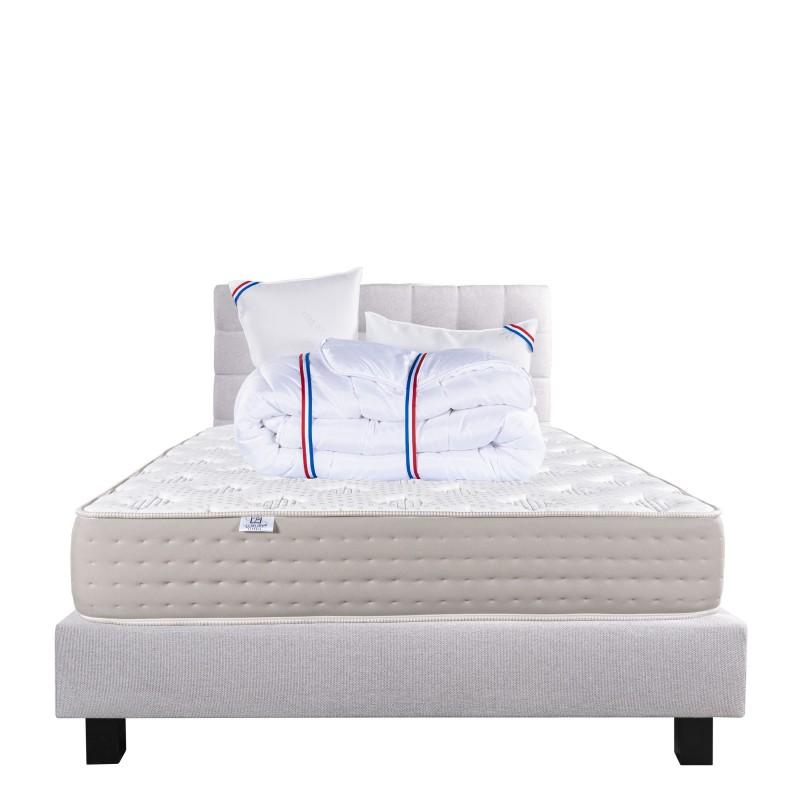 Ce matelas est constitué de différentes couches de mousse haute densité et la technologie des ressorts. Nous avons souhaité le combiner avec une couette de 450g avec une très bonne régulation thermique, elle possède un bon gonflant avec un toucher soyeux ainsi qu'un oreiller en 60x40cm avec un garnissage 100% mousse viscoélastique. Pour compléter ce pack nous avons selectionné notre sommier tapissier en bois massif, ainsi que la tête de lit.