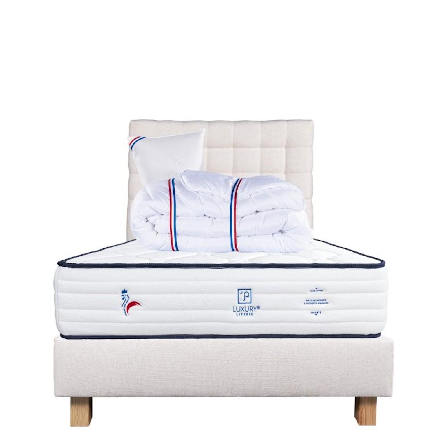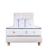 Ainsi qu'un oreiller en 60x40cm avec un garnissage 100% mousse viscoélastique. Pour compléter ce pack nous avons selectionné notre sommier tapissier en bois massif, ainsi que la tête de lit.