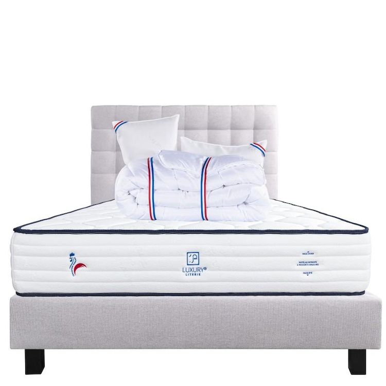 Ainsi qu'un oreiller en 60x40cm avec un garnissage 100% mousse viscoélastique. Pour compléter ce pack nous avons selectionné notre sommier tapissier en bois massif, ainsi que la tête de lit.
