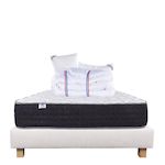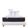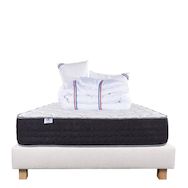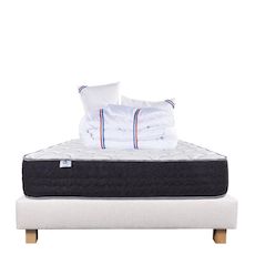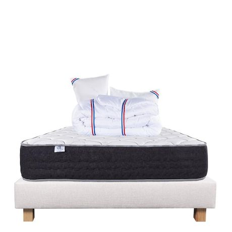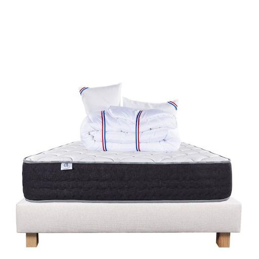 Ce matelas allie le meilleur des deux mondes : des ressorts ensachés durables pour un soutien exceptionnel et une mousse de haute qualité pour un confort incomparable. Nous avons souhaité le combiner avec une couette de 450g avec une très bonne régulation thermique, elle possède un bon gonflant avec un toucher soyeux. Ainsi qu'un oreiller en 60cm x 40cm avec un garnissage 100% mousse viscoélastique. Pour compléter ce pack nous avons selectionné notre sommier tapissier en bois massif.