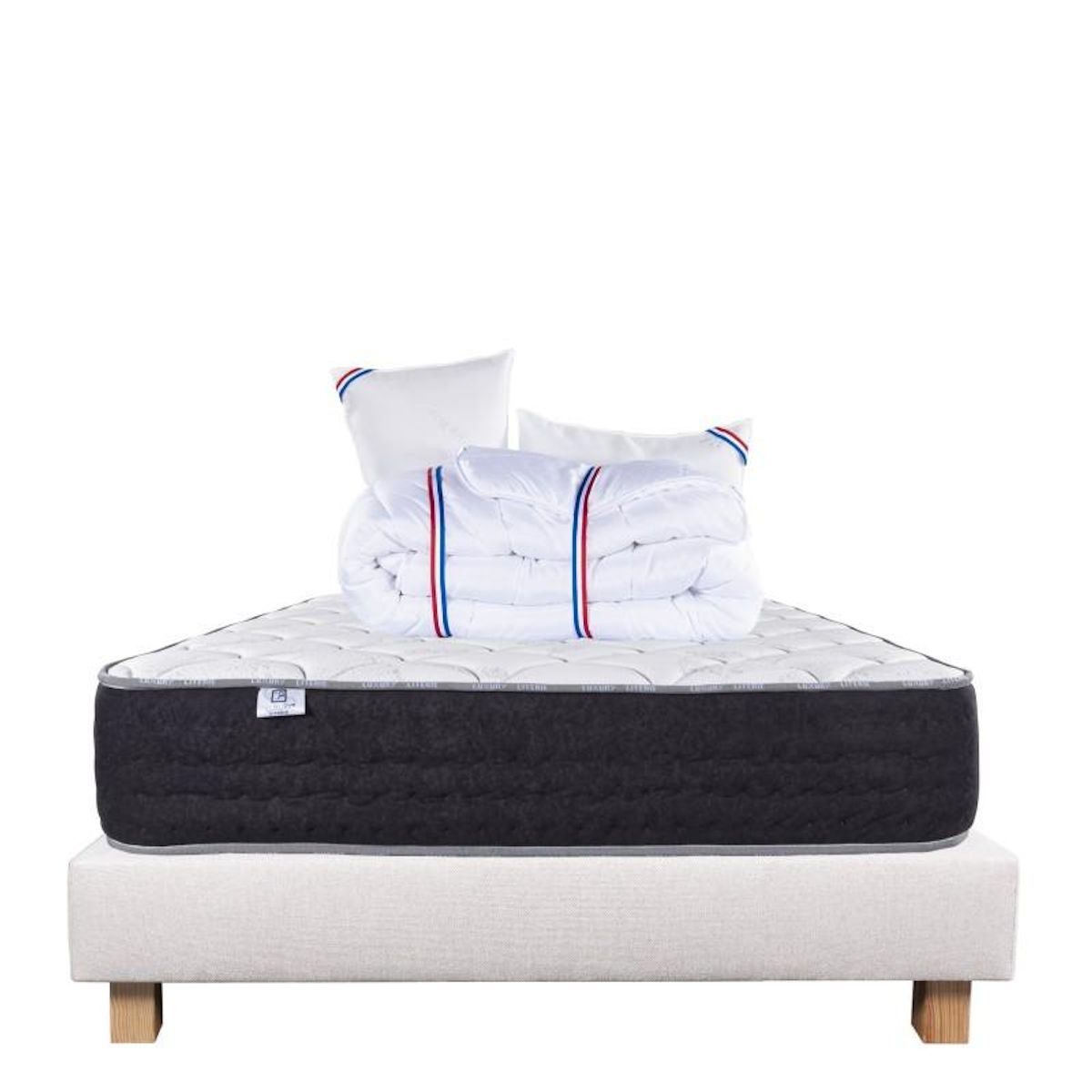 Ensemble matelas <> ferme 7/10, épaisseur 27cm + sommier tapissier beige + couette + oreiller