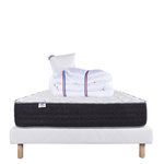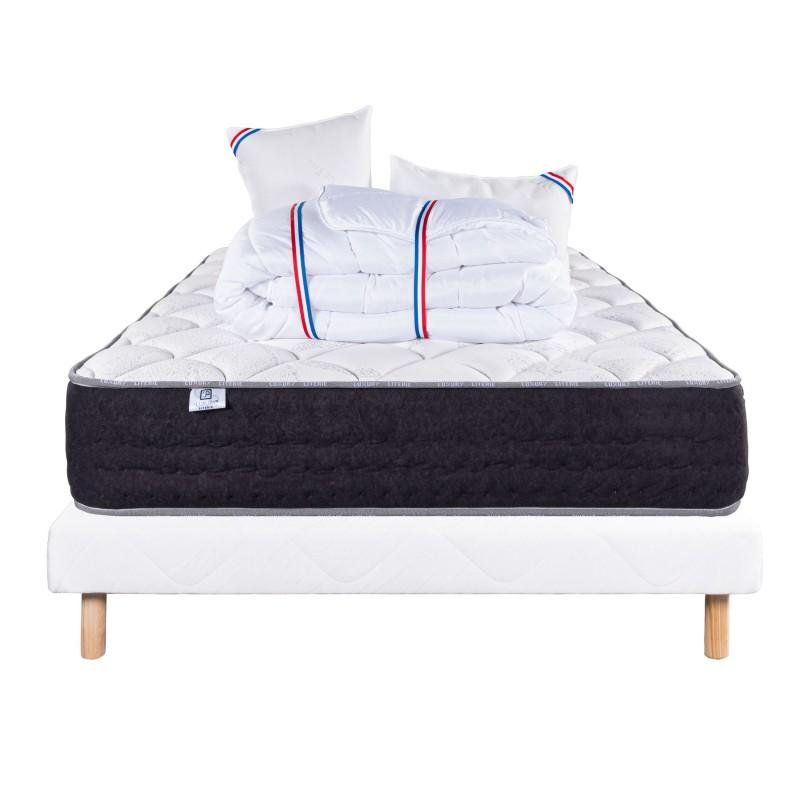 Ce matelas allie le meilleur des deux mondes : des ressorts ensachés durables pour un soutien exceptionnel et une mousse de haute qualité pour un confort incomparable. Vous méritez une bonne nuit de sommeil, et ce matelas est là pour vous offrir exactement cela. Nous avons souhaité le combiner avec une couette de 450g avec une très bonne régulation thermique, elle possède un bon gonflant avec un toucher soyeux. Ainsi qu'un oreiller en 60cm x 40cm avec un garnissage 100% mousse viscoélastique. Pour compléter ce pack nous avons selectionné notre sommier tapissier en bois massif.